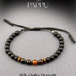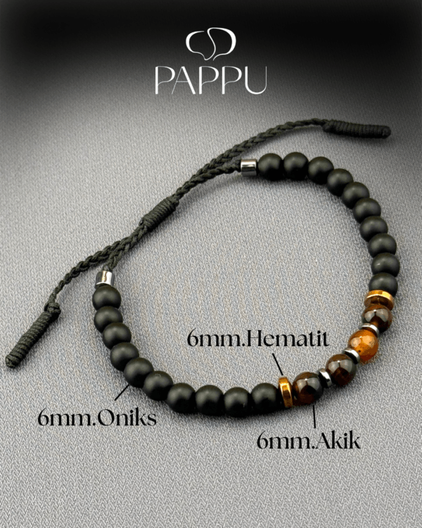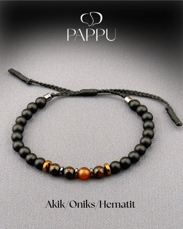 Akik, Oniks ve hematit taşlarının uykularıyla tasarlanan bu unisex doğal taş bileklik, hem şıklık hem de enerji arayanlar için ideal bir aksesuardır. Doğal taşlar 6mm.dir ve düzeni, 0,8 mm. Dayanıklı paraşüt ipi ve el örgüsü ara bağlantı detayıyla tamamlanmıştır. Günlük kullanıma uygun, modern ve anlamlı bir bileklik modelidir.