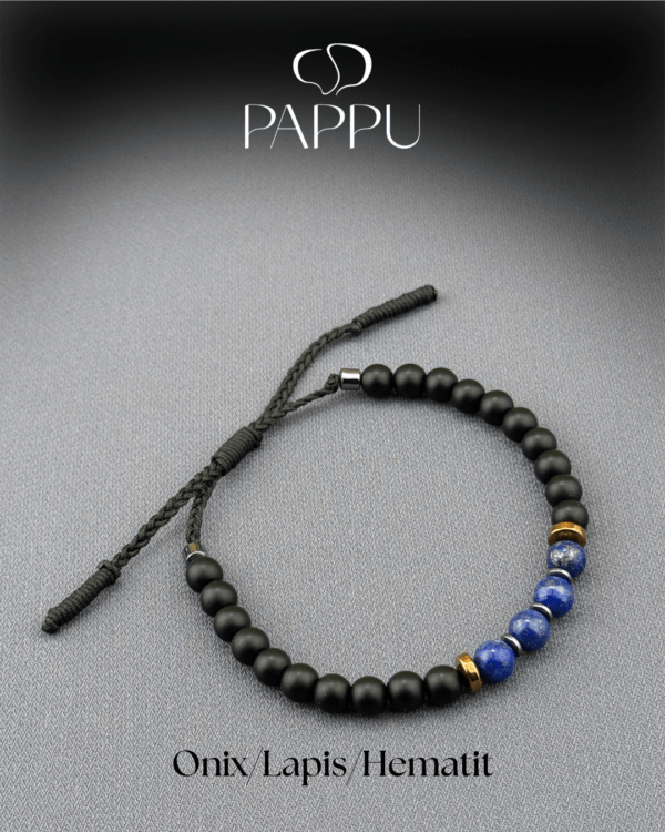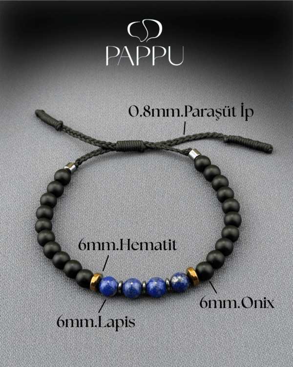 Lapis, Oniks ve hematit taşlarının uykularıyla tasarlanan bu unisex doğal taş bileklik, hem şıklık hem de enerji arayanlar için ideal bir aksesuardır. Doğal taşlar 6mm.dir ve düzeni, 0,8 mm. Dayanıklı paraşüt ipi ve el örgüsü ara bağlantı detayıyla tamamlanmıştır. Günlük kullanıma uygun, modern ve anlamlı bir bileklik modelidir.