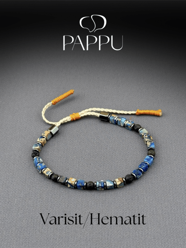 Varisit, lav taşı ve hematit taşlarının uykuyla tasarlanan bu unisex doğal taş bileklik, hem şıklık hem de enerji arayanlar için ideal bir aksesuardır. Doğal taşların düzenli düzeni, 0,8 mm dayanıklı paraşüt ipi ve el örgüsü ara bağlantı detayıyla tamamlanmıştır. Günlük kullanıma uygun, modern ve anlamlı bir bileklik modelidir.