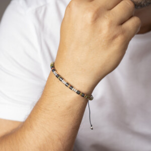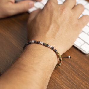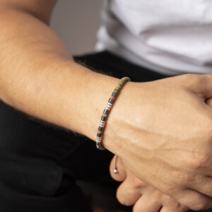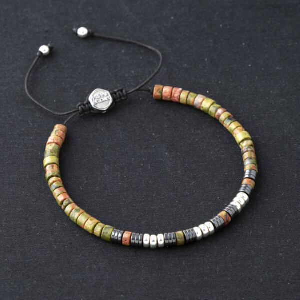 Unakit ve hematit taşından üretilmiş 925 ayar gümüş bileklik, hem şık aksesuar hem de güçlü bir enerji kaynağıdır. Bu özel rondela kesim bileklik, koruma ve duygusal denge sağlayarak günlük hayatınıza pozitif bir dokunuş katar. Kırmızı ve siyah renkleriyle üniseks tasarım, her tarza uyum sağlar.
